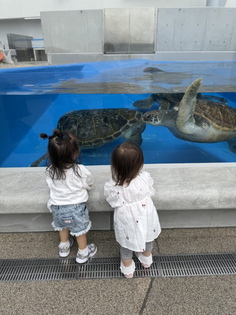 ジッとカメを眺める2歳児2人。(笑)